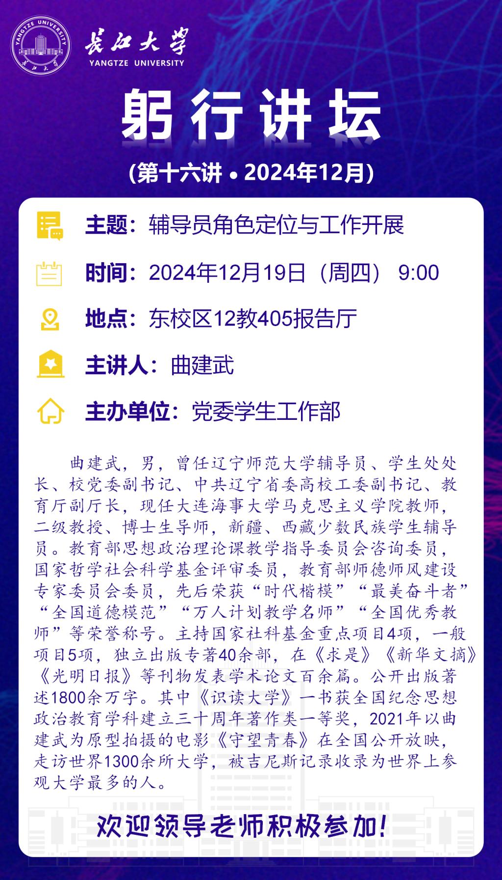 曲建武,曾任辽宁师范大学辅导员、学生处处长、校党委副书记、中共辽宁省委高校工委副书记、教育厅副厅长,现任大连海事大学马克思主义学院教师,二级教授、博士生导师,新疆、西藏少数民族学生辅导员。教育部思想政治理论课教学指导委员会咨询委员,国家哲学社会科学基金评审委员,教育部师德师风建设专家委员会委员,先后荣获“时代楷模”“最美奋斗者” “全国道德模范”“万人计划教学名师”“全国优秀教师”等荣誉称号。主持国家社科基金重点项目4项,一般项目5项,独立出版专著40余部,在《求是》《新华文摘》《光明日报》等刊物发表学术论文百余篇。公开出版著述1800余万字。其中《识读大学》一书获全国纪念思想政治教育学科建立三十周年著作类一等奖,2021年以曲建武为原型拍摄的电影《守望青春》在全国公开放映,走访世界1300余所大学,被吉尼斯记录收录为世界上参观大学最多的人。