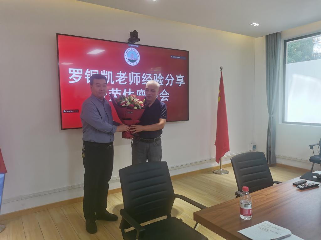 会议伊始,由张科代表全体学工人员向资深学工办主任罗铜凯老师送上鲜花,祝贺罗老师光荣退休,并邀请罗铜凯老师分享了他多年从事学生工作的心得和感悟。