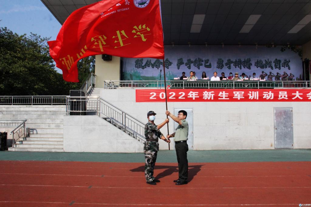 在雄壮的军歌中,徐波为军训师、军训团、军训连授旗。动员大会结束后,各教官组织学生有序展开训练。