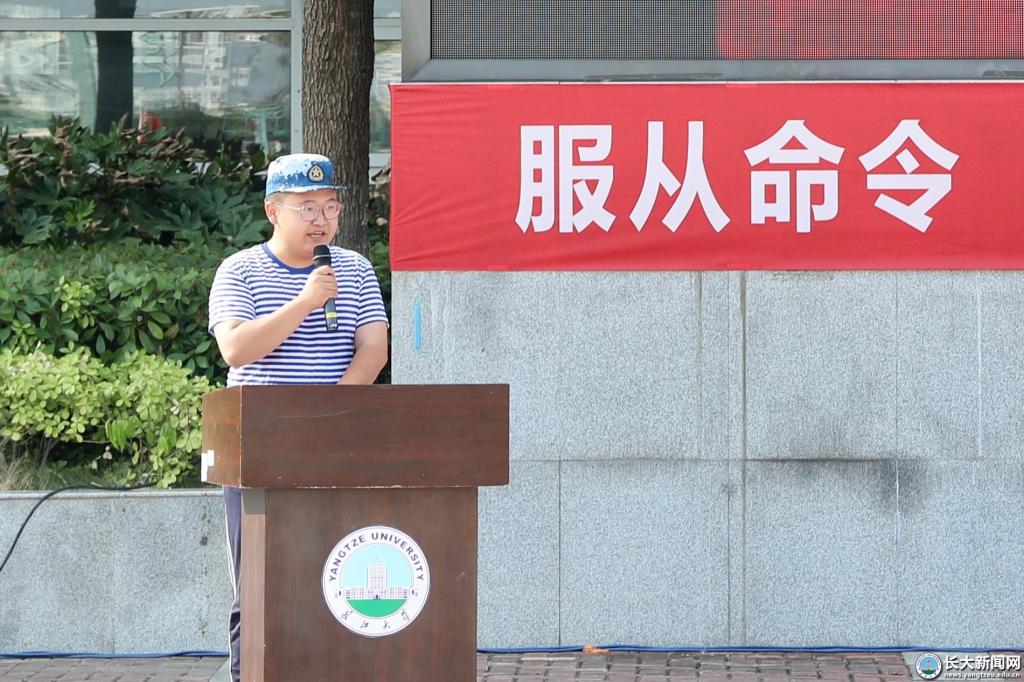 军训教官代表王伟发言,承诺将严守纪律,遵守各项要求及规定,以身作则,以过硬的本领带领同学们履职担当,和大家共同提高。