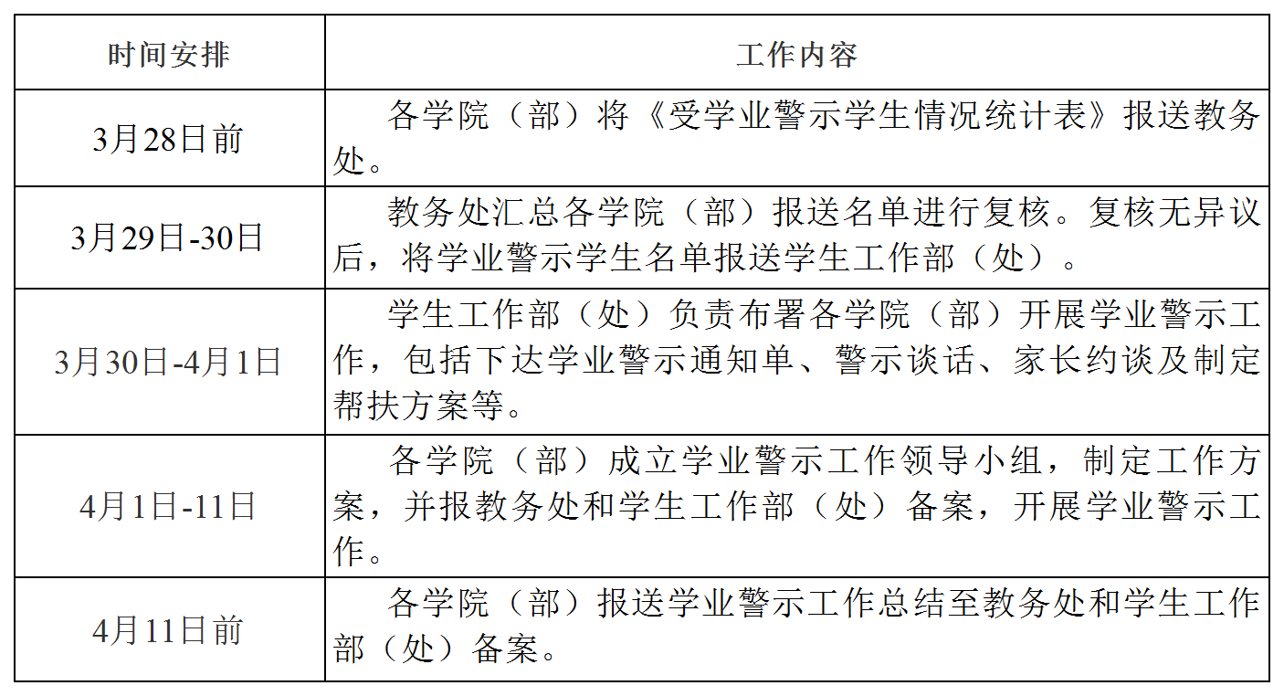 1.高度重视工作。学业警示和学籍处理政策性强、涉及面广,事关学生切身利益优良学风建设,各学院(部)应高度重视、认真组织,教学、学工联动,责任到人,做到零差错严格按照学校相关文件开展工作,学校将学业警示工作纳入教学常规指标考核,教务处负责对学业警示的效果进行检查