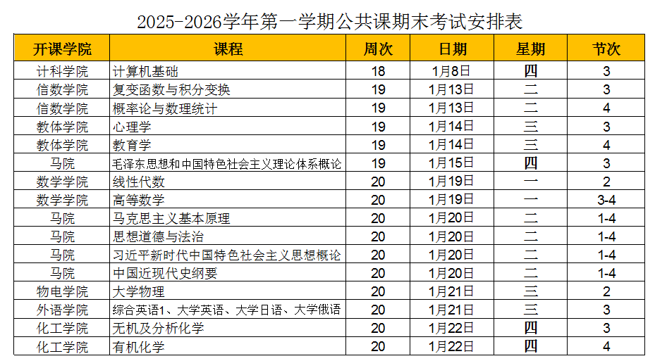 1.考试课程期末考试安排从202618日(18周星期四)开始,123日(20周星期五)结束。