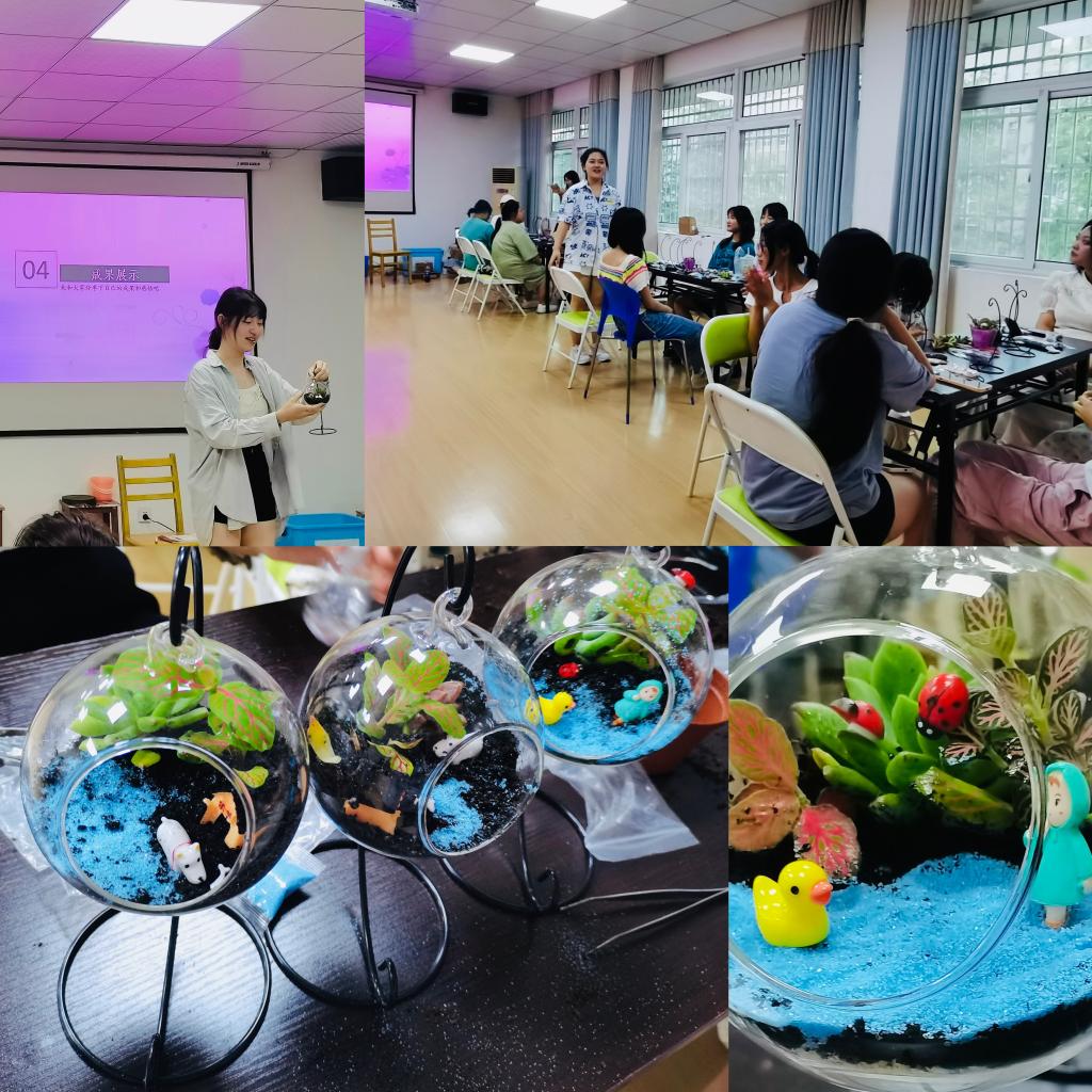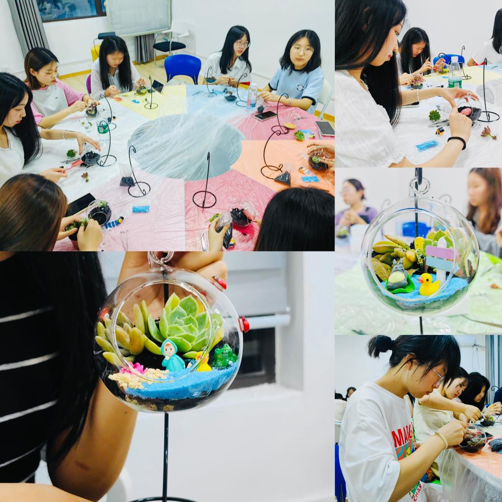 “哇塞,你的布置好精妙呀,可以传授一些思路给我吗?”“同学,我独自完成给多肉的培土有点困难,你可以帮我一下么?”“瞧,这只卡通摆件像极了我家的小狗,参与这次活动我可真是太开心啦!”活动现场,欢声笑语一直环绕在同学们耳畔,大家一边交流一边创作,尽情发挥自己的奇思妙想。一个多小时之后,绿植、沙粒、摆件等便在同学们的巧手中变成了形态各异的盆栽微景观。