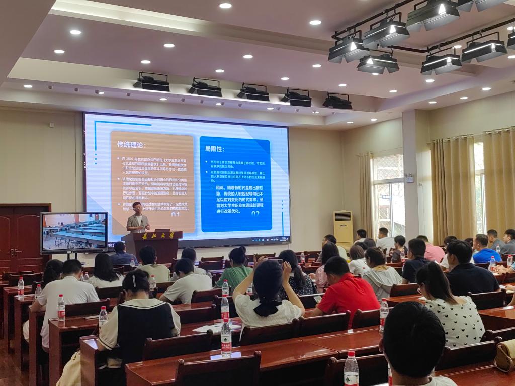学工部讯(通讯员 张思祺)为了贯彻落实党的教育方针,切实抓好“课堂”教书育人主阵地,进一步提升全体专职辅导员的教学水平,7月6日下午,我校党委学生工作部分别在荆州东校区11教201室和就业宣讲大厅举办《心理健康教育》、《职业发展规划》与《就业指导》课程培训,武汉校区通过线上同步参与。