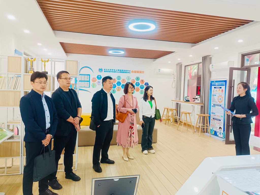 在荆州东校区宝石花“一站式”学生社区共享空间,武汉工程大学党委学生工作部副部长、大学生心理健康教育中心主任徐迪迪,专职教师雷辉,黄冈师范学院大学生心理健康教育与咨询中心专职教师李凡繁参观了我校学生心理健康教育中心,先后检查了咨询预约接待大厅、功能室、积极心理体验室、个体以及家庭咨询室、团体辅导室等建设情况,对“整体布局、硬件设施”有了基本了解。