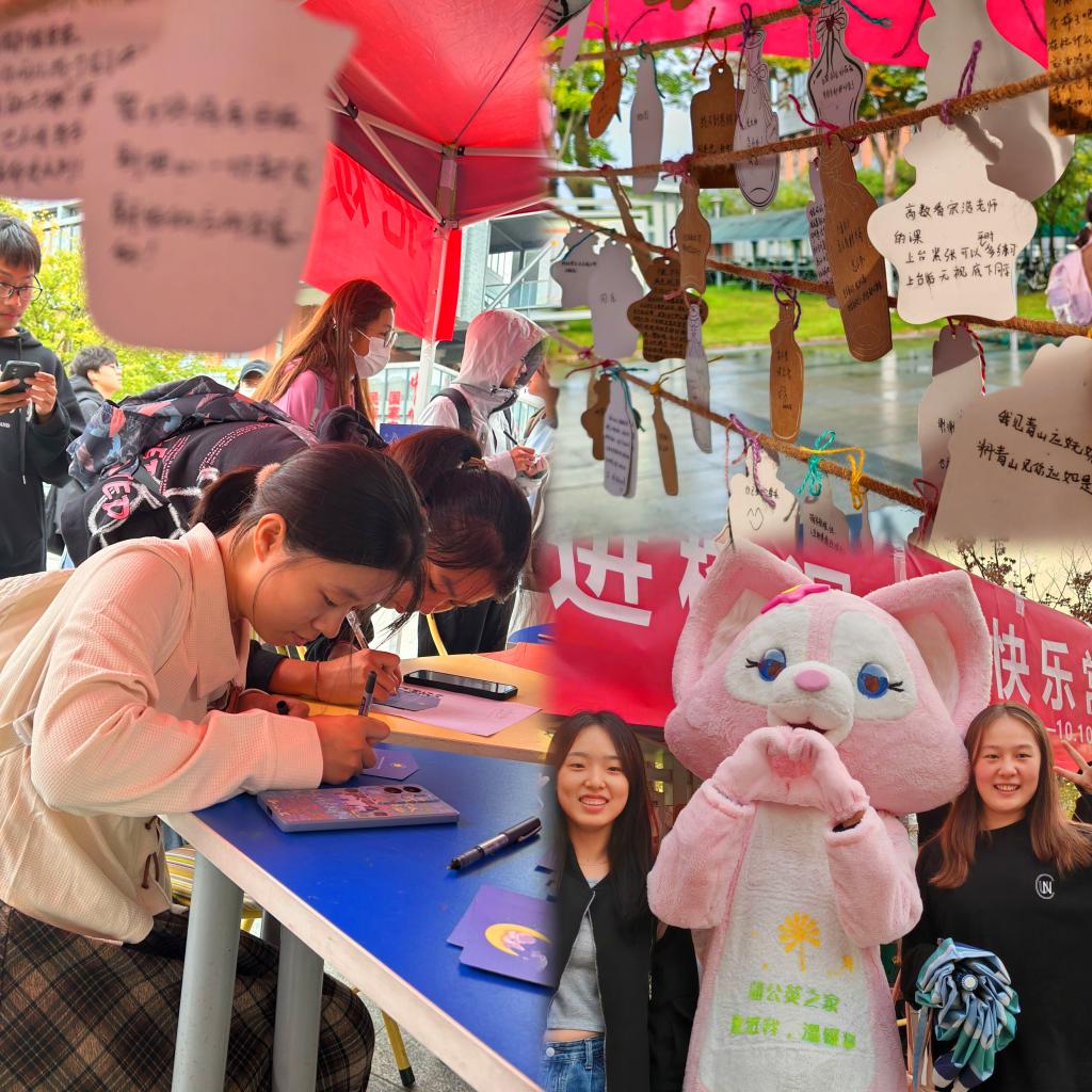 武汉校区举办“心声漂流,解忧互助”主题活动,现场设有“信箱”、“树洞”、“拒绝焦虑”窗口。虽然下着蒙蒙细雨,但气氛热闹又温馨。同学们通过“纸笔传情”,为好友投送一封封匿名祝福信;通过“树洞解忧”,为陌生人解答一个个难言的烦恼;通过“卡片寄语”,用一张张正能量的明信片鼓励自己要保持快乐。