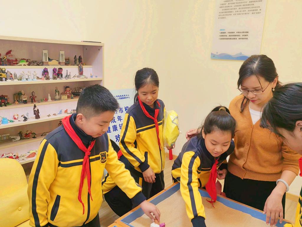 参观过程中,同学们在各间功能室相继体验了“智能互动宣泄仪、VR虚拟体验机、音乐放松椅、沙盘”等专业心理设备。在心理沙盘室内,王娟老师耐心引导孩子们自由挑选并组合自己喜欢的摆件,同时畅所欲言讲述内心真实的理由,以此来培养大家勇于表达情感与想法的能力。在减压放松室里,同学们争先恐后躺在音乐放松椅上,伴着轻柔舒缓的歌曲,闭上双眼舒展身体,尽情释放着压力。在情绪宣泄室中,男孩子们踊跃穿戴好护具,奋力击打拳击器材,欢声笑语一片。
