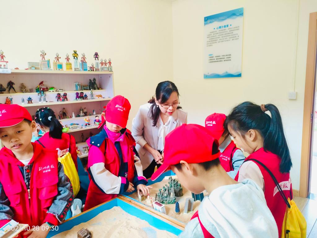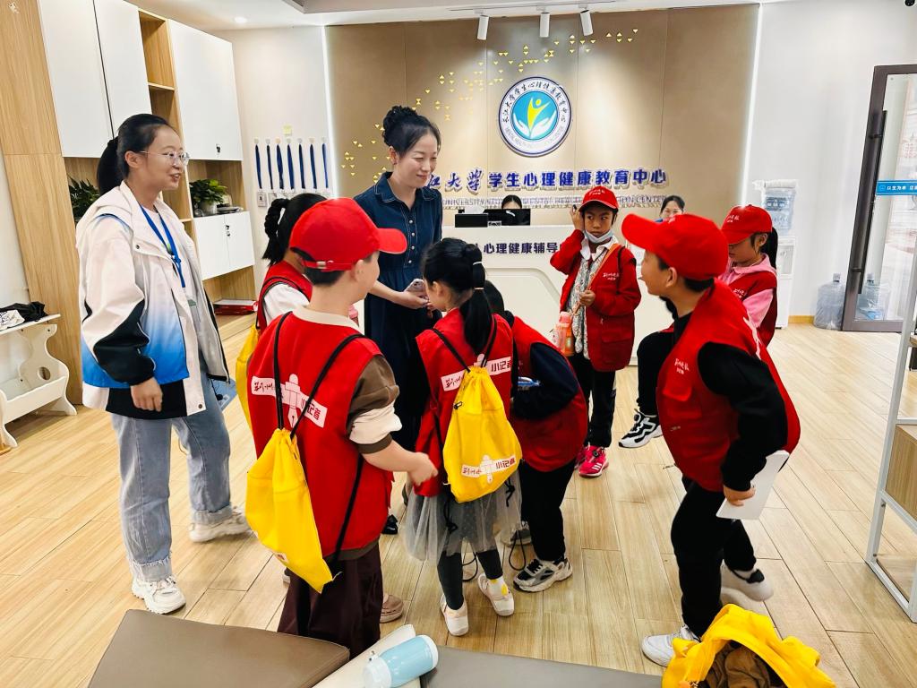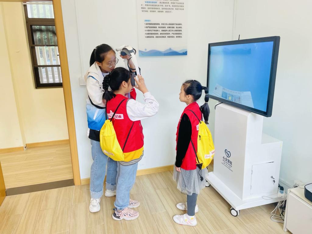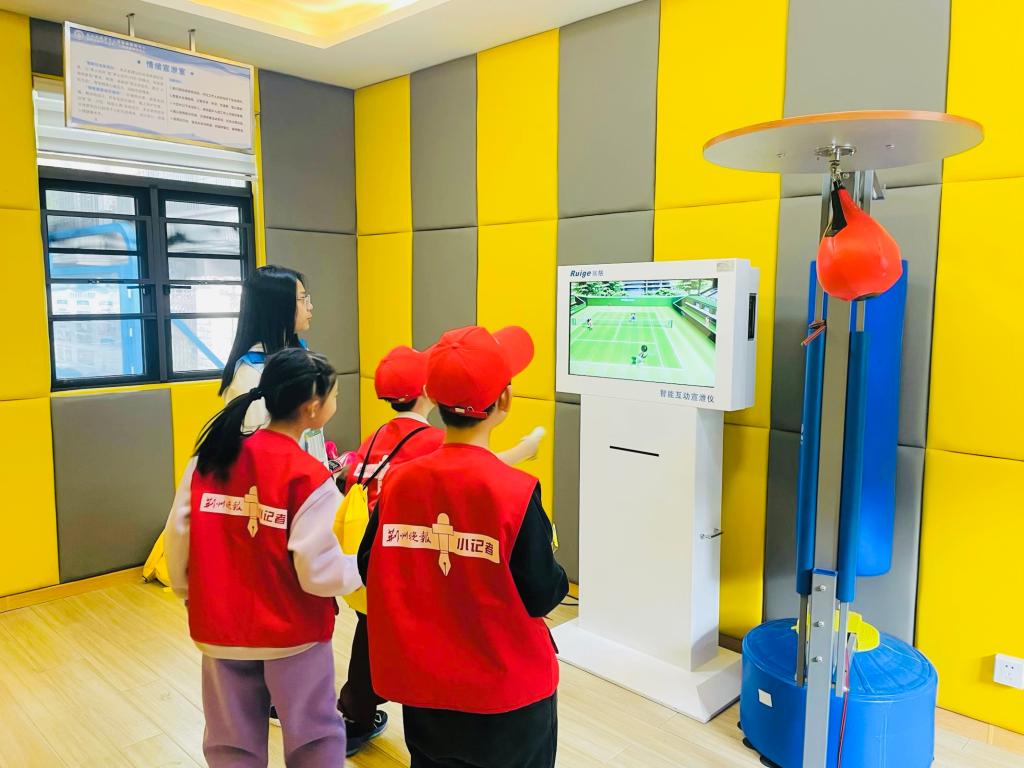 “老师,心理咨询是什么?我遇到烦心事了也可以打电话预约吗?”“沙盘看起来好神秘,它与心理健康有什么关联呢?”“VR心理综合训练系统太酷啦!戴上眼镜,我感觉如同身临其境!”“拳击套组真的太好玩啦,虽然我累到流汗,但整个人特别快乐!”……参观过程中,“小记者们”用充满好奇的目光四处观察,相继来到“咨询预约接待大厅、沙盘室、减压放松室、情绪宣泄室”,或踊跃地提出自己的疑问,或兴奋地体验相关设备,老师与志愿者们陪同并耐心讲解。