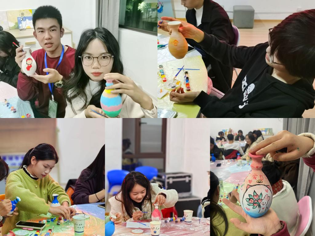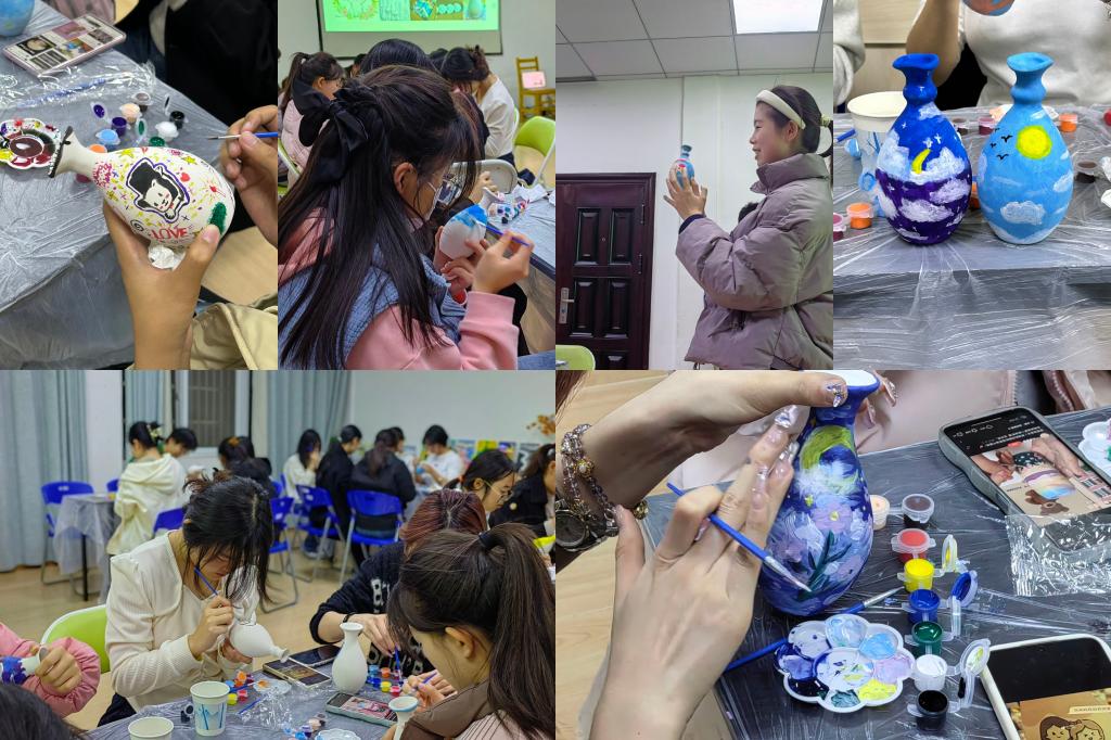 伴随着柔和舒缓的音乐,“手绘花瓶”活动正式开始。同学们充分发挥个人想象力,借助五彩斑斓的颜料,在瓶身上仔细描摹着,创造出独具特色的作品。“我画的是《小王子》的图案,重点突出了狐狸和玫瑰花,希望能够表达自己对生活的热爱和对爱情的向往。”“瞧,我的花瓶采用了‘毕加索’画风!抽象之感是不是别有一番韵味?”“爱自己,是终身浪漫的开始。我在瓶身写下这句话,想要呼吁大家关注身心健康。”……活动现场气氛热烈,不时传来阵阵欢声笑语。