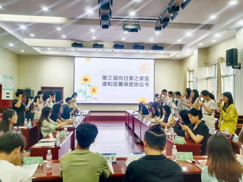 “为了保障心理咨询服务的顺利进行,帮助每一位来访者获得良好的体验,作为一名朋辈心理志愿者,我同意遵守以下工作规范……”在第三届向日葵之家兼职辅导员张泽同学的带领之下,新一届向日葵之家全体成员起立,高擎右拳,许下了神圣的誓言。随后,同学们还签署了保密协议书,并正式佩戴上工作牌。