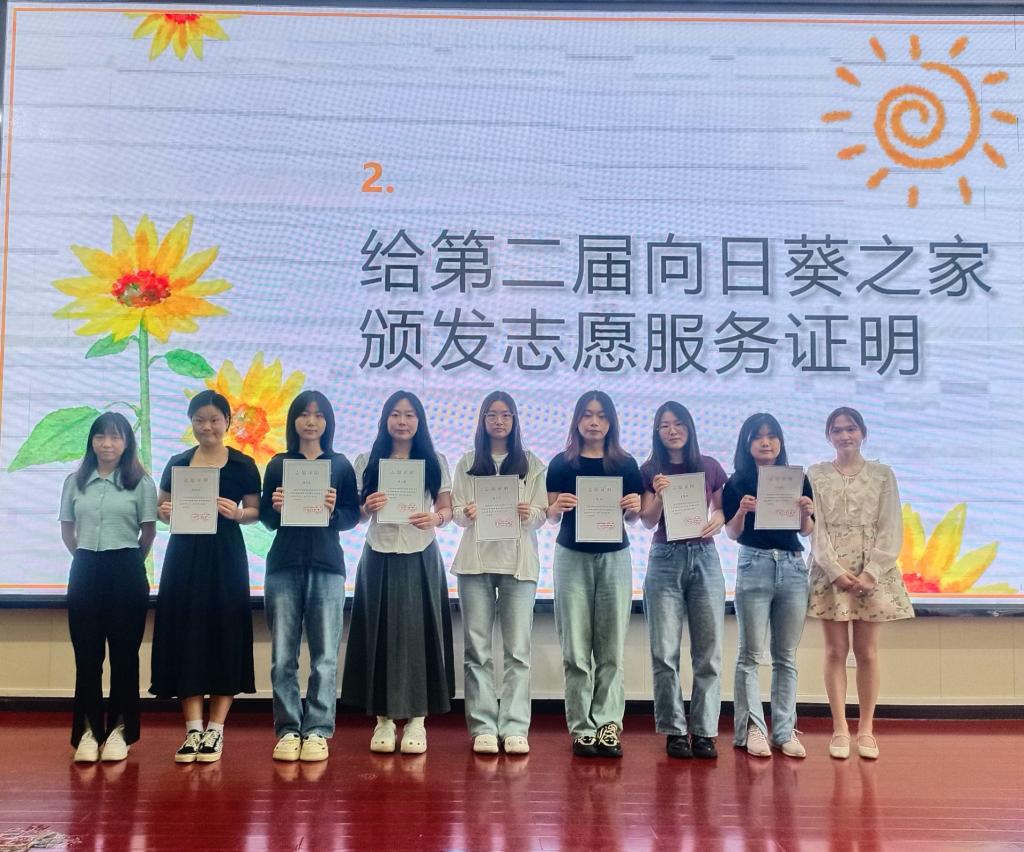 “感恩遇见,有幸并肩。在平凡的工作中,我们积极践行朋辈心理志愿者的责任与担当,最终得以蜕变成如今这般勇敢、坚毅、自信的模样。”会议伊始,第二届向日葵之家成员登台领取志愿服务证明,并分享了离任感言。“衷心祝愿各位老师工作顺利、学生学姐毕业快乐、新成员们带领组织飞向更高更远的地方!”