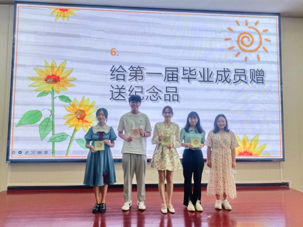 “毕业成员赠礼”环节,老师们登台为2024届毕业生送上精致的纪念品,祝福同学们在未来的生活中保持乐观心态、不断追求梦想、勇敢面对挑战、永远光芒四射。毕业生代表、第一届向日葵之家成员金鹏飞同学在发言中回顾了自己作为一名朋辈心理志愿者的点点滴滴。他表示,毕业不仅意味着一个阶段的结束,更标志着新篇章的开启,自己将保持一如既往的热情,在人生征程中再创佳绩。