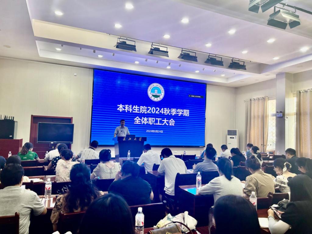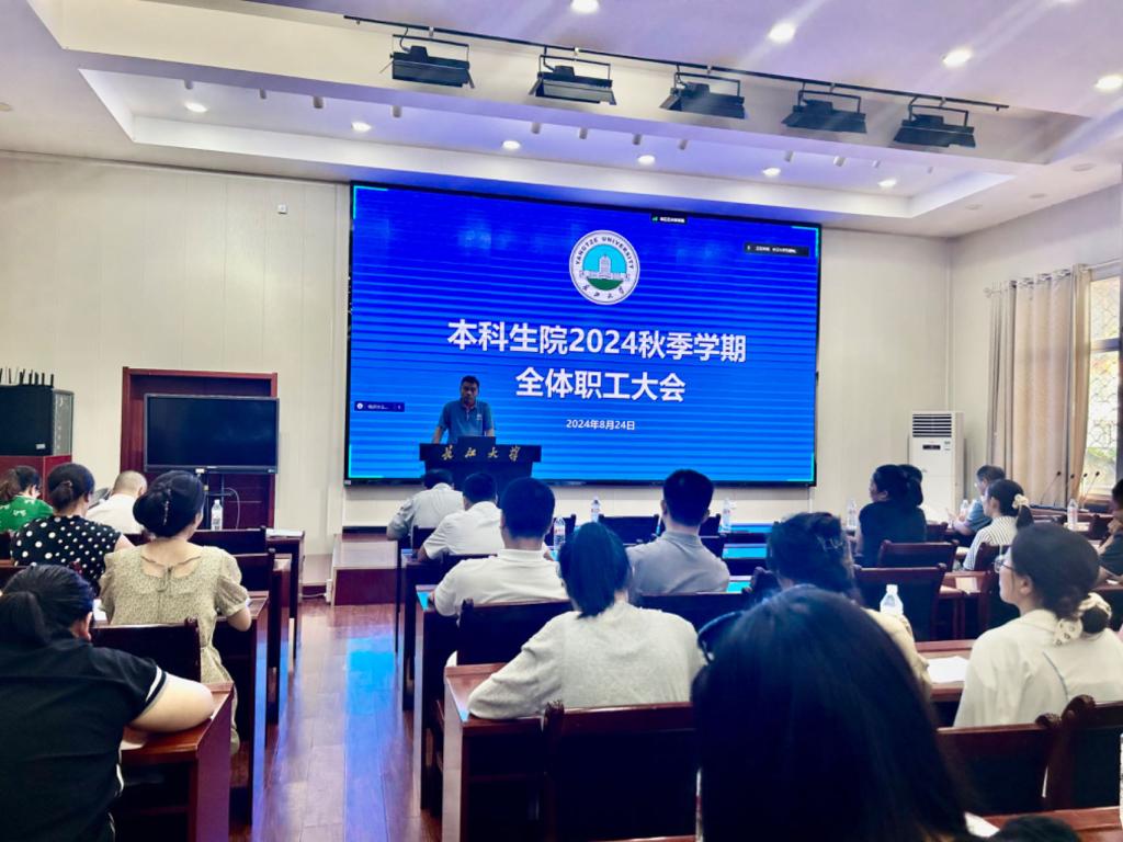 (通讯员 石博妹)8月24日下午,本科生院在就业宣讲大厅召开2024秋季学期本科生院全体职工大会,武汉校区线上参会,布置新学期本科教育教学工作。校党委常委、副校长许锋出席会议并讲话,本科生院全体职工参会。会议由党委学生工作部部长、本科生院常务副院长张科主持。