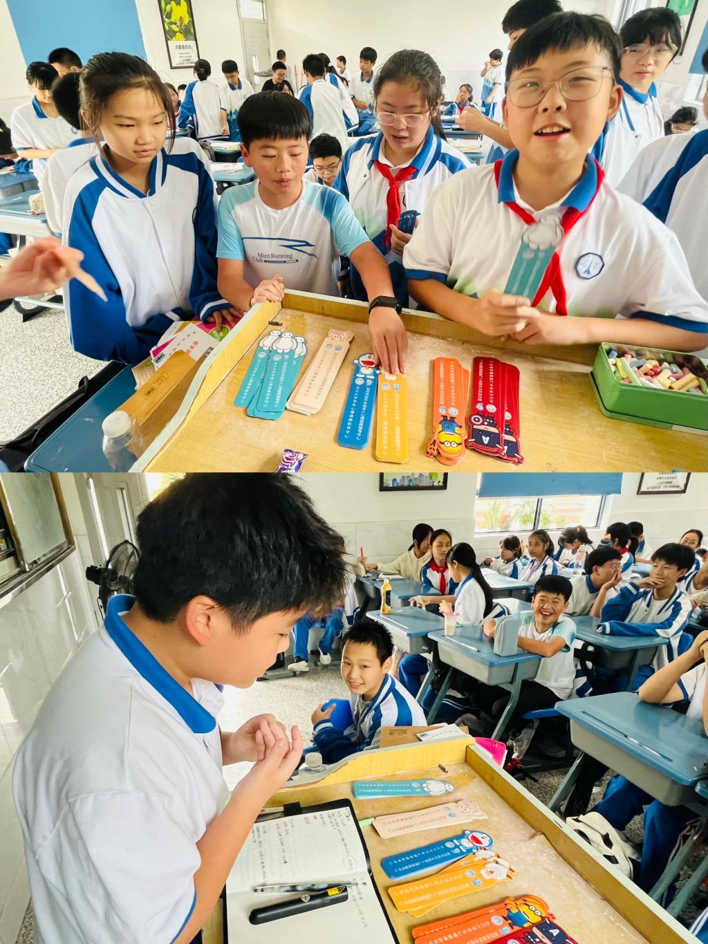 “如果感到幸福你就拍拍手……”活动伊始,随着音乐声响起,同学们相互在手中传递着摇铃,现场一片欢声笑语。每当伴奏戛然而止,被选中的同学便需登台互动,在黑板上写下一件令自己感到幸福的事情,并为之标注相应的指数。