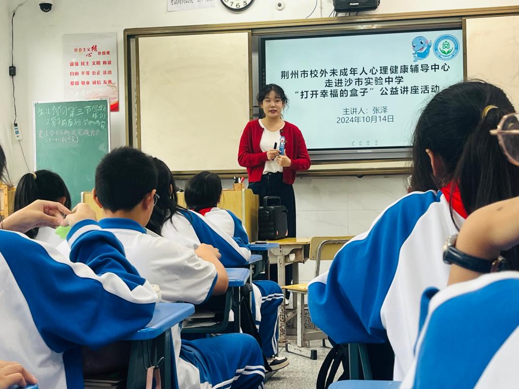 本科生院讯(通讯员 万钰)为了帮助广大青少年增进幸福感,进一步提升心理健康素质,10月14日上午,应沙市实验中学的邀请,荆州市校外未成年人心理健康辅导中心兼职心理咨询师张泽老师入校开展公益讲座及团体辅导活动。