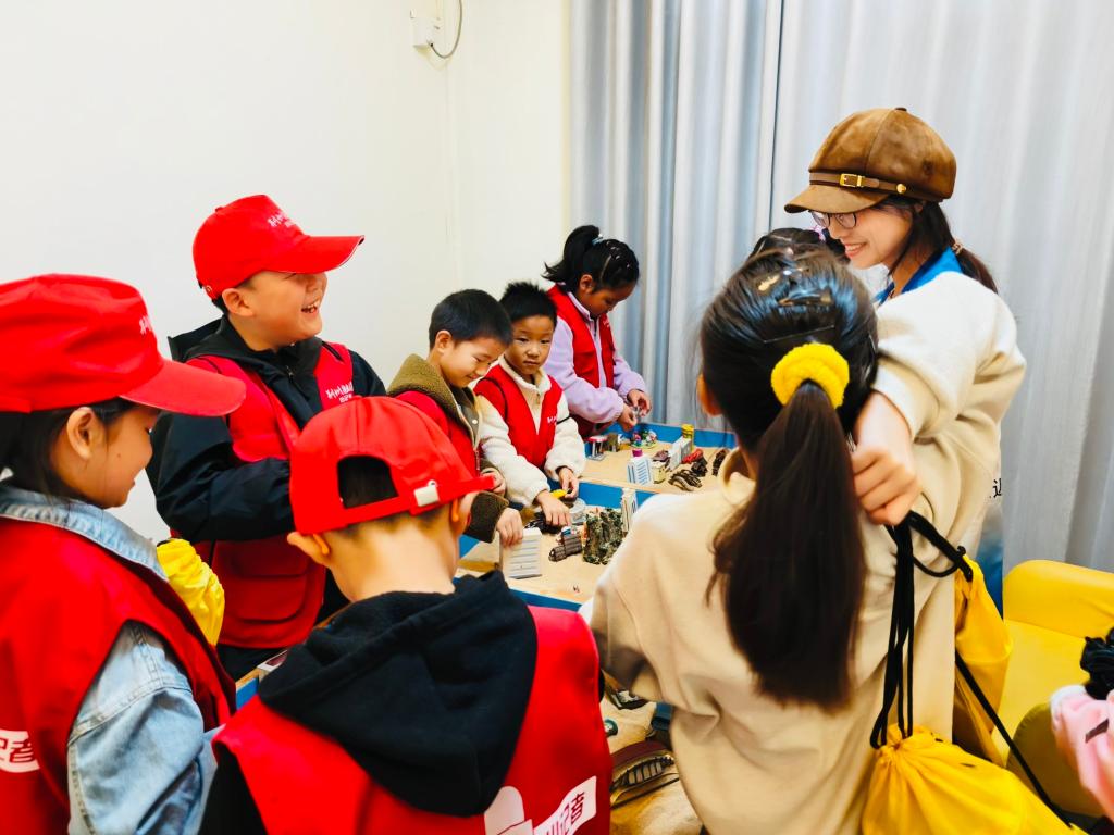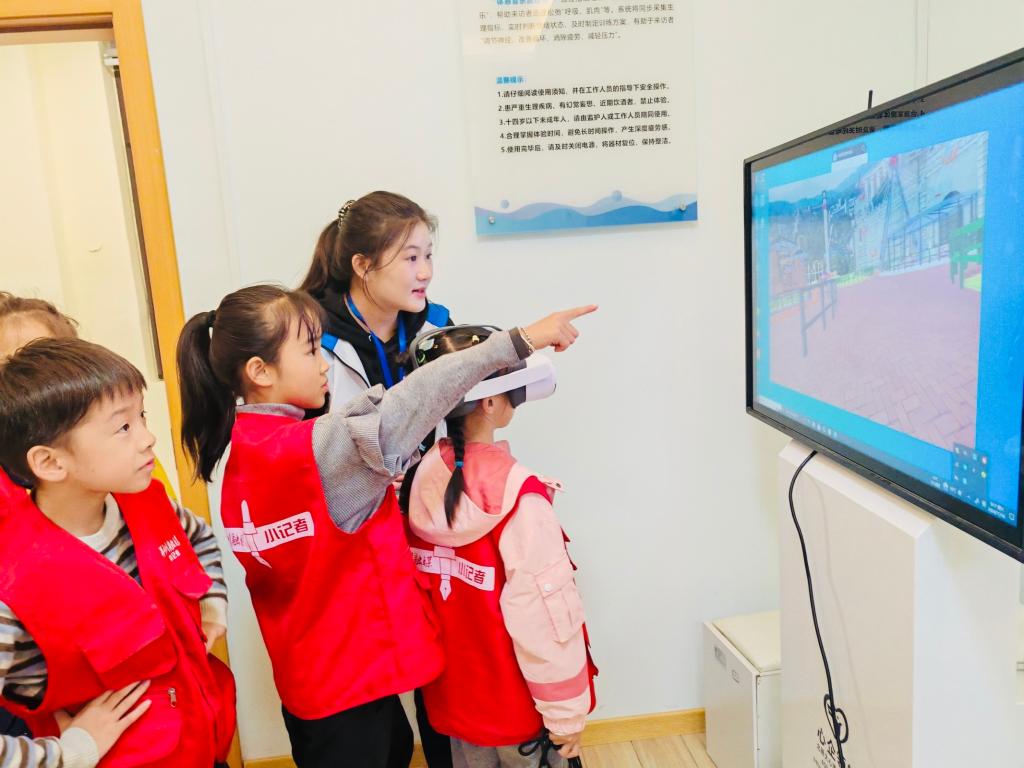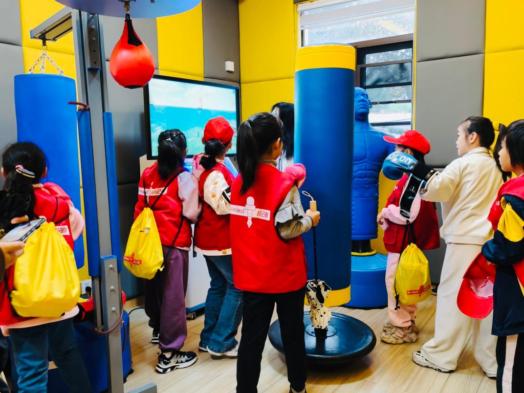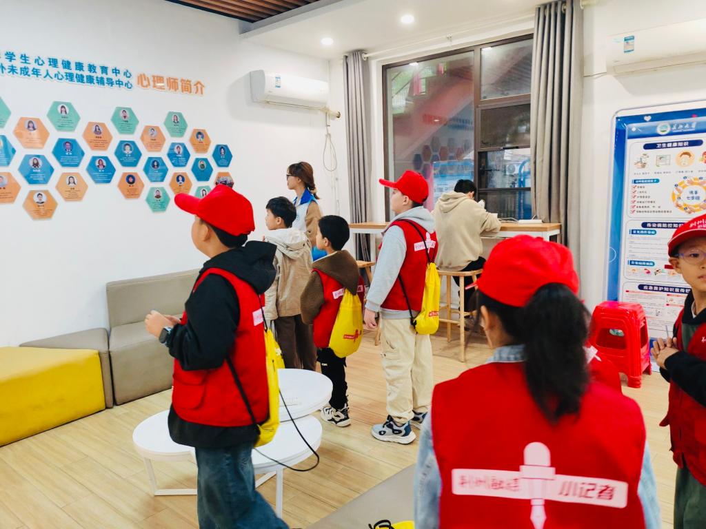 “沙盘好有趣呀,我喜欢用摆件在沙粒上塑造内心世界的感觉!”“VR眼镜真神奇,在虚拟的空间里我可以直冲太空!”“出拳的瞬间,我感到特别快乐!”随后,“小记者们”分别参观了心理沙盘室、减压放松室、情绪宣泄室,聆听了大学生志愿者们的讲解,并争先恐后地尝试各种设备,每个小朋友都乐在其中。