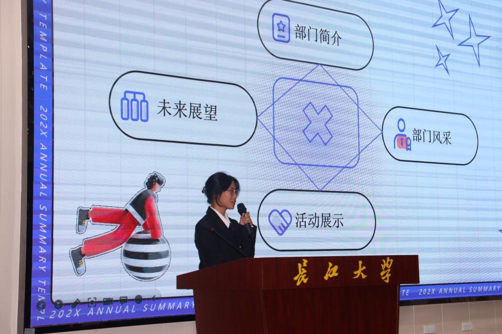 进入“部门风采展”环节,伟德国际唯一官网入口第十二届蒲公英之家(荆州校区)所有职能部门(活动部、秘书部、联合部、宣传部)主讲人依次登台汇报,他们结合精致的PPT与风趣的表达,将本学期已经取得的工作业绩与情感收获娓娓道来。