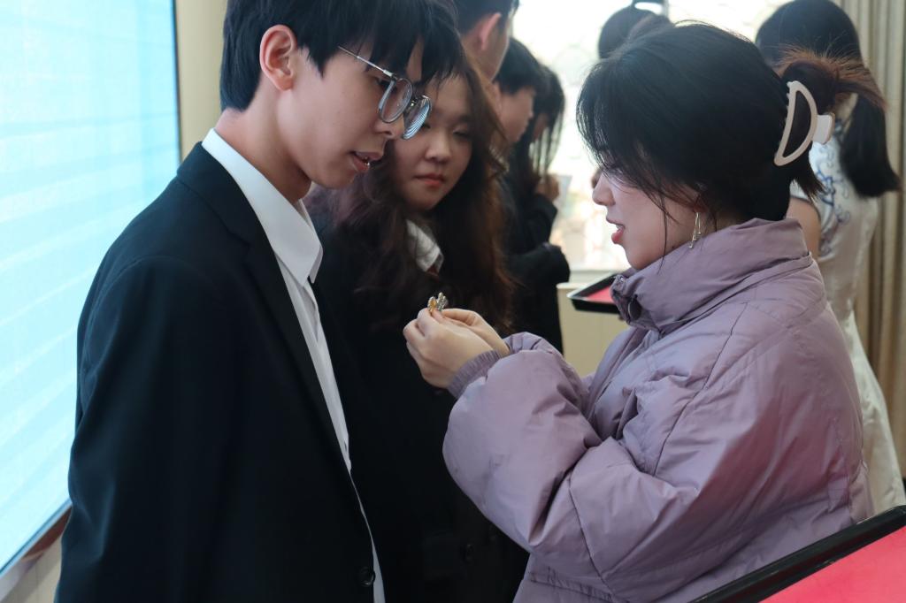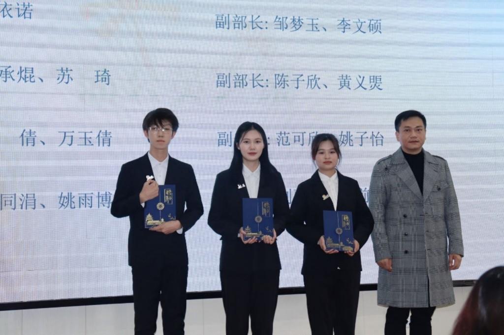 紧接着,颜学俊、王娟、张思祺老师分别登台为干部成员颁发聘书,万钰、蒋毅、唐溢、徐潞杰老师依次上台为新成员代表佩戴会徽,并亲切地合影留念。