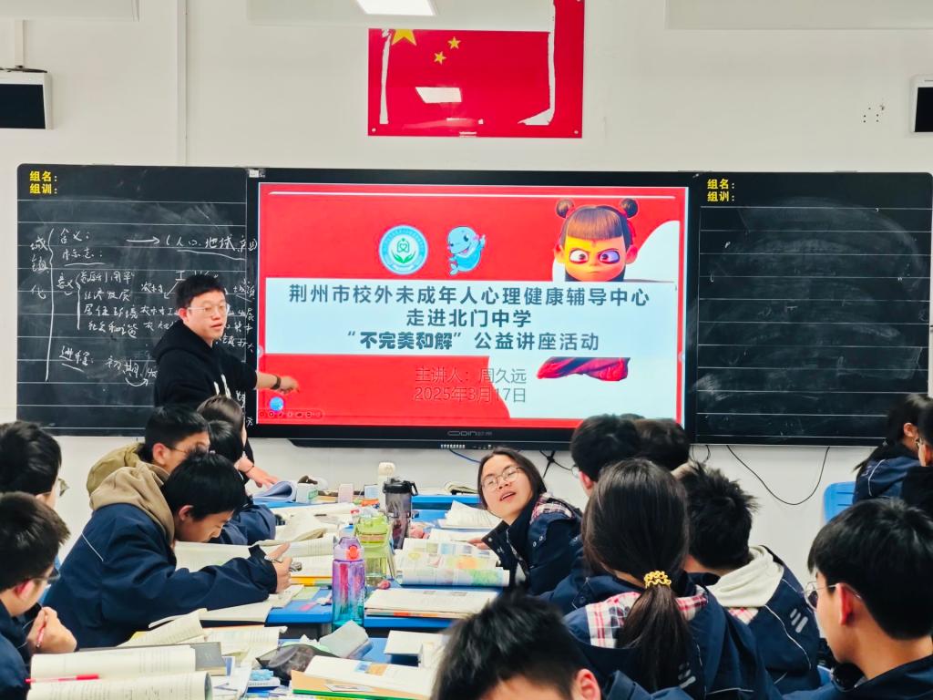 为了帮助同学们切实增强心理健康意识,有效提升自助与助人技巧,周久远老师还发放了荆州市校外未成年人心理健康辅导中心的定制卡通书签以及纸质宣传折页,鼓励大家努力成长为体魄强健、心理阳光、意志坚强的新时代青少年。
