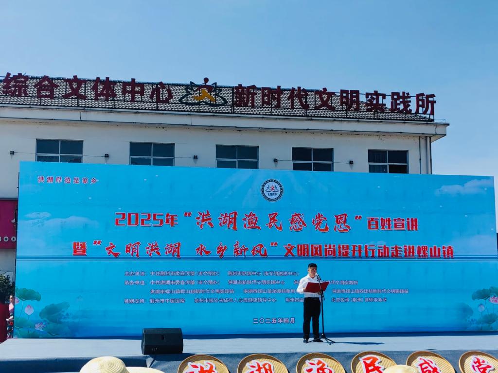本科生院讯(通讯员 万钰)4月15日,荆州市校外未成年人心理健康辅导中心王娟、李刚英老师受邀赴洪湖市螺山镇参加“洪湖渔民感党恩”百姓宣讲暨“文明洪湖·水乡新风”文明风尚提升行动,现场开展公益宣讲及知识科普活动。