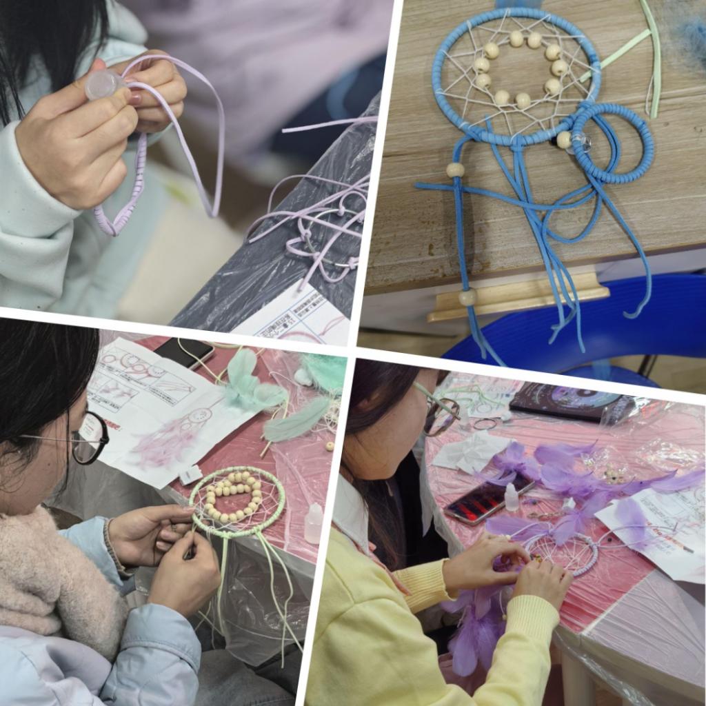 “哇,你编绳子的手法超灵活,可以教一下我吗?”“蓝色寓意宁静与梦想,所以我选择这样搭配,希望在未来能勇敢地追逐自己的梦想!”“你装饰的珠子和羽毛真好看,我能拍张照片吗?”……活动开展过程中,同学们不时低语讨论,或相互给予帮助,并交流制作心得,最后更争相展示作品,现场气氛温馨又融洽。