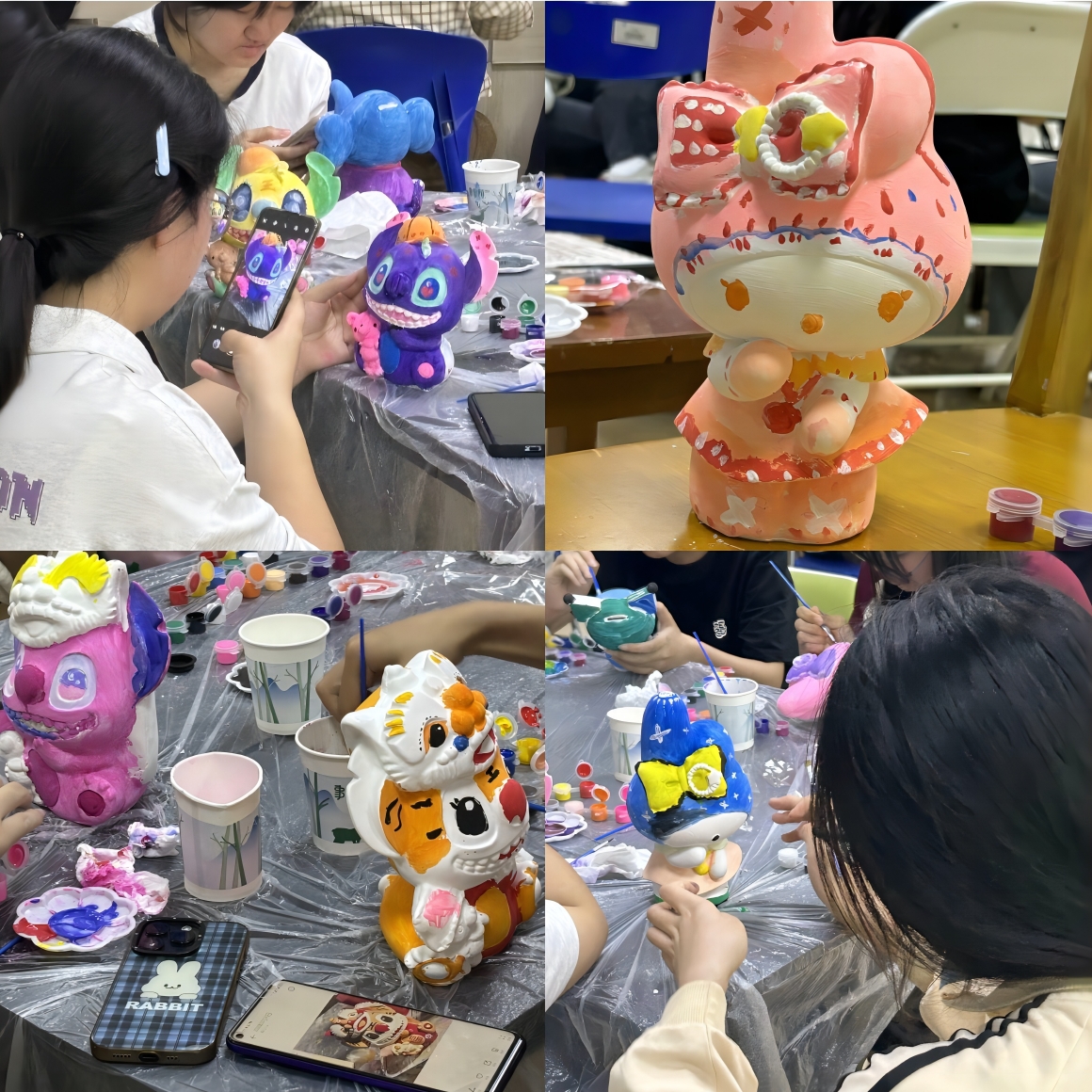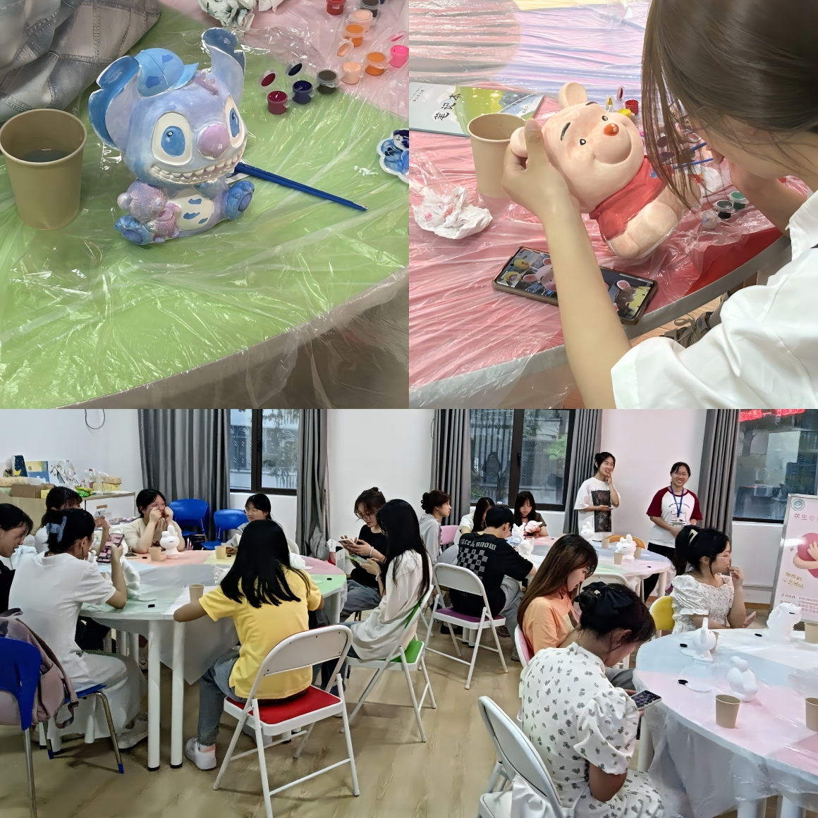 随后,伴随着轻柔的音乐,同学们逐渐沉浸于彩绘的奇妙世界里,借由手中的画笔和斑斓的颜料,尽情抒发着内心的情感。不一会儿,五颜六色的石膏娃娃被创作出来——蓝色的史迪仔、粉嫩的维尼熊、鲜红的九尾狐……在每双巧手的雕琢下,每一个作品都栩栩如生,同学们释放了内心压力,获得了舒缓与满足。