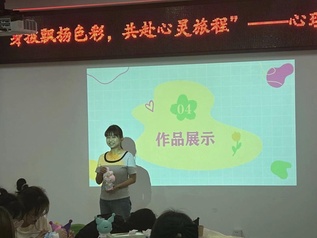 “给石膏娃娃涂色非常有趣!创作的过程本身就是一种心灵的抚慰,我感到前所未有的放松,希望下次还能有机会参加如此有意义的活动!”最后,同学们自告奋勇登台展示自己的作品,大方地介绍创作理念与感受,并开心地合影留念。