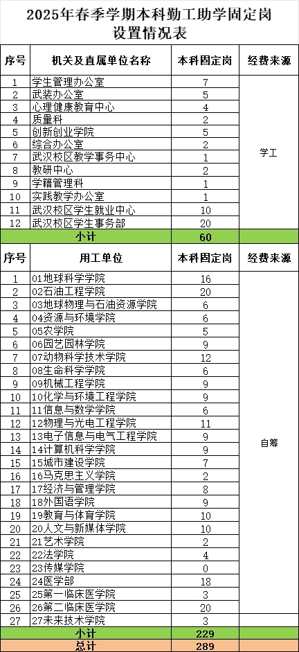 附件: 2025年春季学期本科生勤工助学固定岗位设置结果