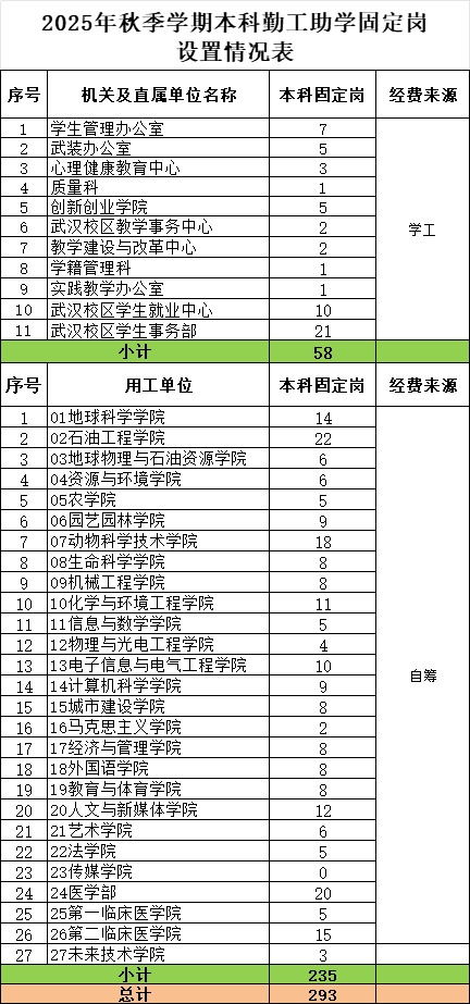 附件: 2025年秋季学期本科生勤工助学固定岗位设置结果