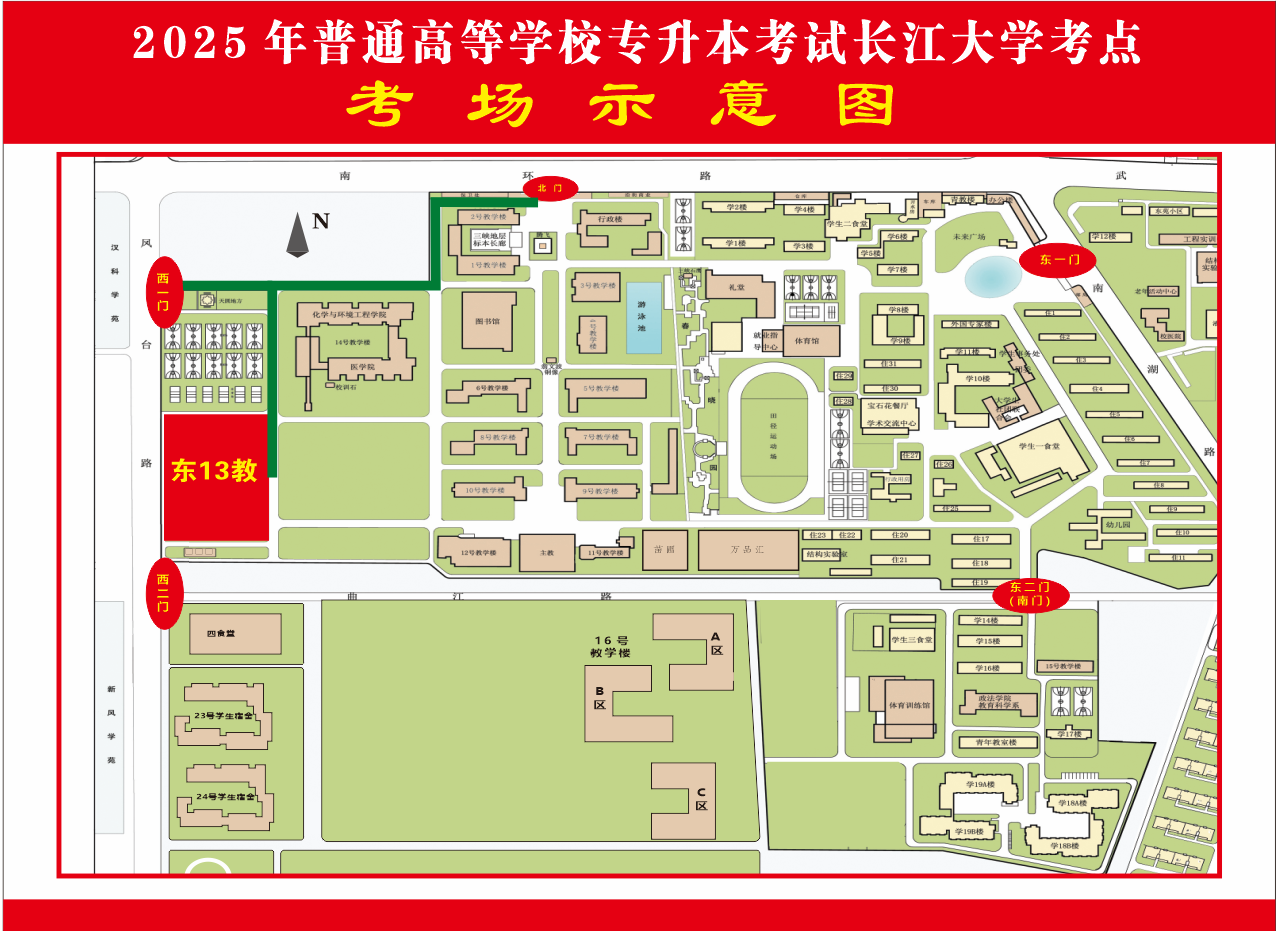 2.2025年伟德国际唯一官网入口专升本考试考场设置在东校区(湖北省荆州市学苑路1号)13号教学楼,东校区各校门均可进出,建议广大考生走西一门进出校园
