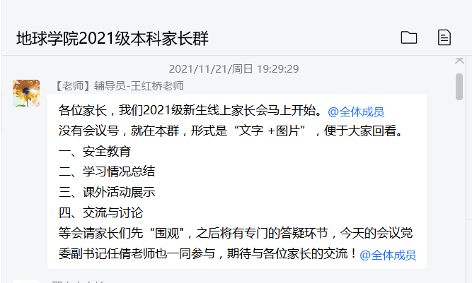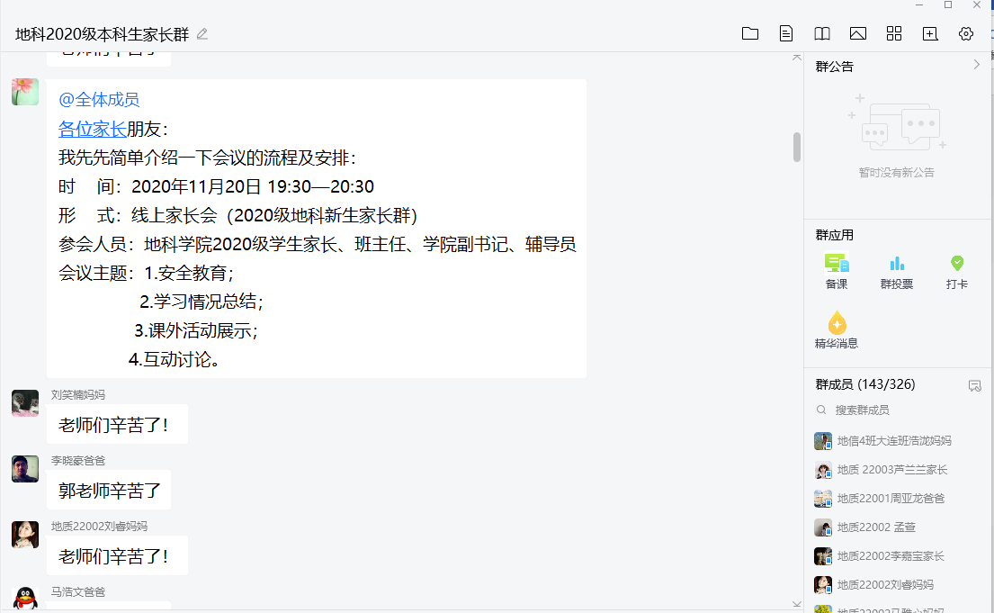 在群内,学院领导率先垂范,辅导员、班主任、主要学生干部均入群答疑解惑,实现家校联系“直通车”。当我们把考研送温暖的照片发到家长群时,家长为学院的暖心与用心点赞;当我们将陈宁生教授的课程实践内容发给家长,群内留下了“这样的课堂更加直观生动,为长大点赞”的回复。