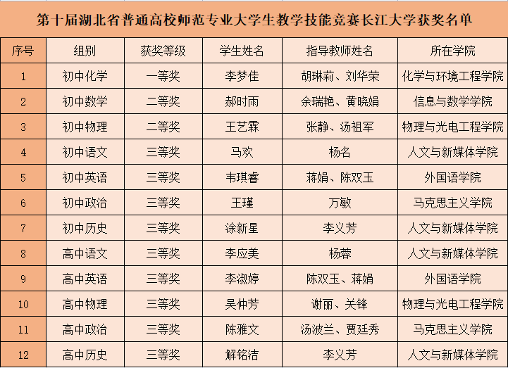 新闻网讯(通讯员 刘乐承 高丽萍)5月20日至22日,第十届湖北省普通高校师范专业大学生教学技能竞赛决赛采用线上线下相结合方式举行。我校12名参赛选手获奖,其中来自化学与环境工程学院的李梦佳同学获初中化学组一等奖,信息与数学学院的郝时雨、物理与光电工程学院的王艺霖2位同学分获初中数学组、初中物理组二等奖,其余9名同学分获初中组、高中组三等奖。