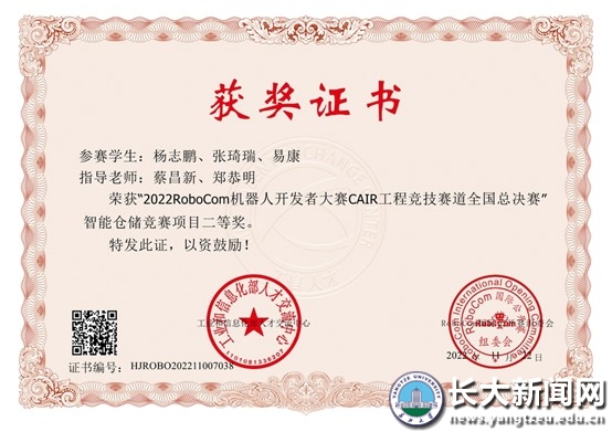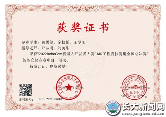 新闻网讯 近日,2022 RoboCom机器人开发者大赛智能仓储竞赛全国总决赛评审落幕。电子信息学院蒋思健、金权韬、王梦阳、杨志鹏、张琦瑞、易康等同学从全国总决赛中脱颖而出,分获全国一等奖、二等奖各一项。这是我校学生首次参加RoboCom机器人开发者大赛。