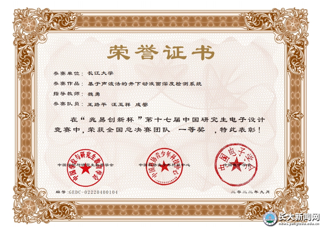 新闻网讯 近日,“兆易创新杯”第十七届中国研究生电子设计竞赛全国总决赛评审落幕。电子信息学院研究生王路平、汪玉祥、成鋆等同学从全国5000多支队伍中脱颖而出,获全国总决赛一等奖,团队指导老师魏勇获全国总决赛优秀指导教师奖。本次获奖是我校在中国研究生电子设计竞赛中首次摘得全国一等奖。