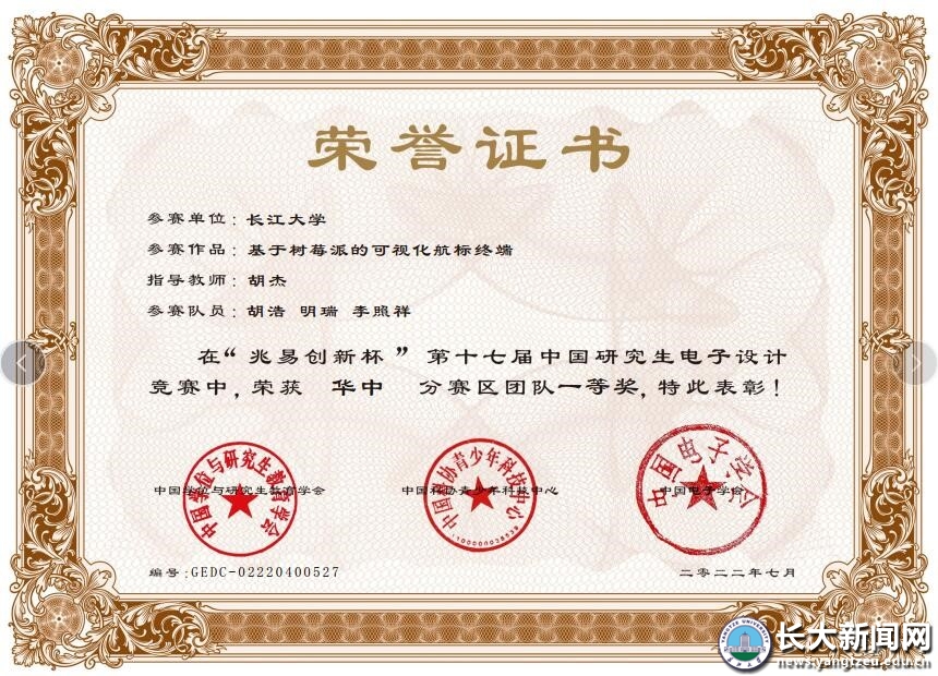新闻网讯 近日,第十七届“兆易创新杯”中国研究生电子设计竞赛华中赛区评审落幕。计算机科学学院研究生胡浩、明瑞、李照祥等同学在胡杰老师的指导下,经过不懈努力,从各大高校1000多支参赛队伍中脱颖而出,获得团队一等奖。