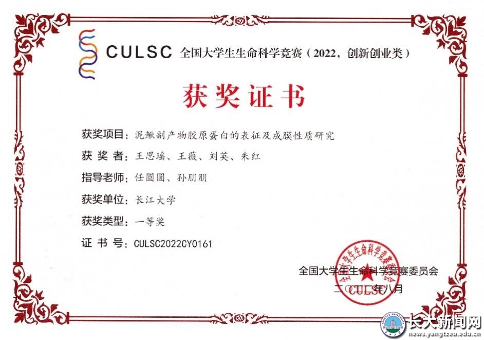 新闻网讯(通讯员 孙朋朋)近日,由生命科学学院任圆圆、孙朋朋老师指导,王思瑶等同学完成的《泥鳅副产物胶原蛋白的表征及成膜性质研究》作品,在全国大学生生命科学竞赛(创新创业)中获一等奖。