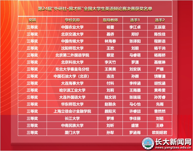 新闻网讯(通讯员 车桥)近日,第24届“外研社•国才杯”全国大学生英语辩论赛全国总决赛在线上举行,由外国语学院李佳丽和刘韬同学组成的代表队,在罗博老师的指导下,与138支来自全国各地的参赛队伍经过八轮循环赛的激烈角逐,最终获得全国总决赛三等奖。