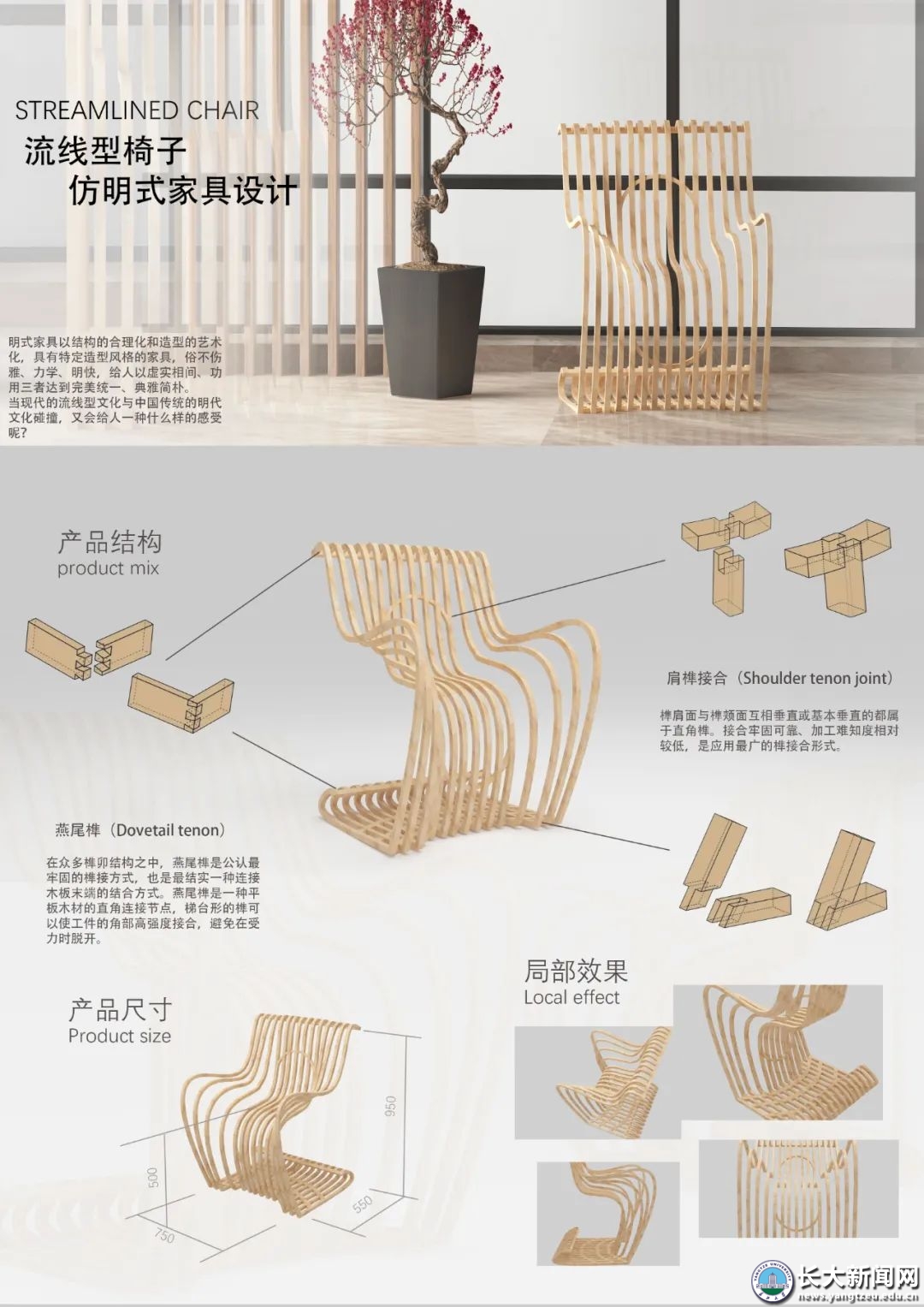 该作品从明式家具的太师椅而来的灵感,结合优美的线条,以及个人的审美结合而成。整体由一根线条的起伏变化而成,中间层平稳,整体用横向木结构,用明式家具的特有榫卯结构加以连接和固定。突破明代家具的厚重与沉稳的红木式家具,采用现代原木色,给人以清新的感觉,更符合年轻一代的审美观念。