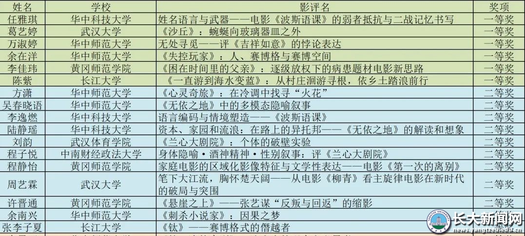 新闻网讯(通讯员 柴攀)经过半年的征稿和评选,湖北省第二届大学生影评大赛获奖名单于2月24日揭晓。艺传学院陈紫等同学斩获一等奖1项、二等奖1项、三等奖2项、优秀奖2项,共计6项。