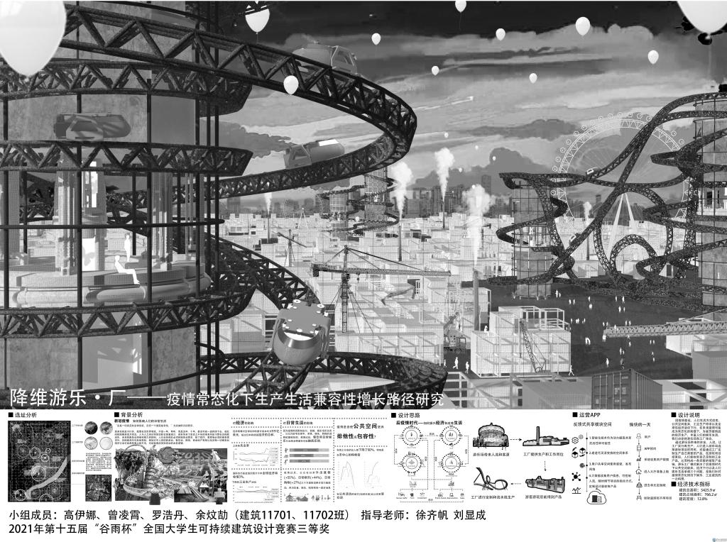 本次比赛时间历时3个月,参赛学生高伊娜、曾凌霄、罗浩丹、余炆劼利用暑假时间在指导老师徐齐帆和刘显成的指导下完成了参赛作品《降维游乐·厂——疫情常态化下生产生活兼容性增长路径研究》的设计,最终成功入围决赛,获得奖项。