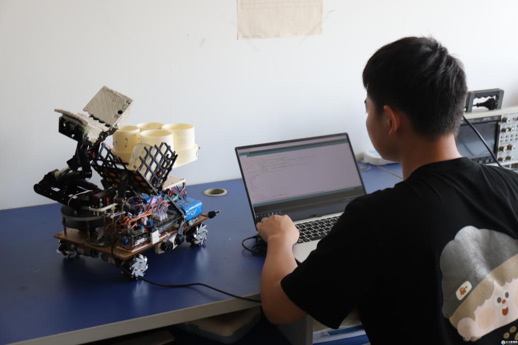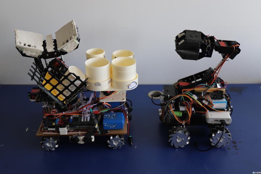 这个装置具有怎样的特色与创新点呢?据负责人李文志介绍,小车添加了“收集结构”可以一次性收集多种垃圾集中投放,提高效率。“在比赛的时候,有些机器采用推土机式的方法进行收集垃圾,有些还是一个一个去收集分拣,这样效率很慢。”他们的创新就是“收集结构”采用了机械臂和可旋转的托盘容器,小车可以通过垃圾识别系统,将垃圾进行分类处理,机械臂可以将垃圾抓放到指定的容器当中,随后集中进行投放。“在未来只需要稍作改进,我们的机器就可用于部分场景的垃圾搜寻与分拣或者是物料的搬运等工作。”