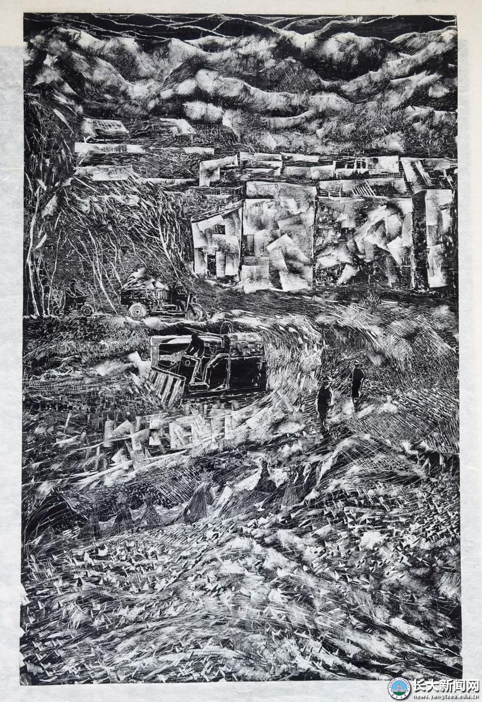 画作构图巧妙,运用了独特的刀法与版画技法,前后反复修改,历时两年才完成。创作过程中,其得到了导师岳进副教授给予的许多指导。王一酩目前已保送我校美术与书法专业研究生。